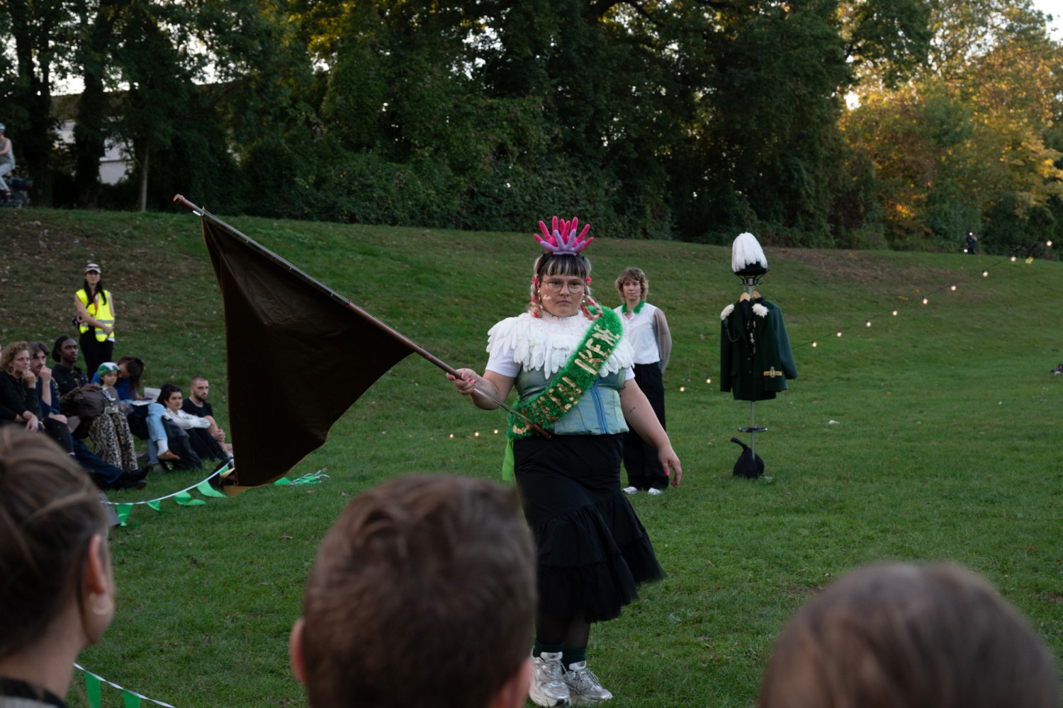 Im Dialog zwischen Fahnen, Gesang und Blasinstrument entsteht auf einer Wiese am Deich hinter der Schwankhalle ein Ritual zwischen Unterhaltungsshow und urbanem Brauchtum. Die Performance fragt nach der Rolle der Gemeinschaft in Städten und nach dem Weiterleben von kulturellem Erbe. Umkreisung für Umkreisung wird die Wiederholung zum Symbol für das Aufbrechen von Traditionen.
